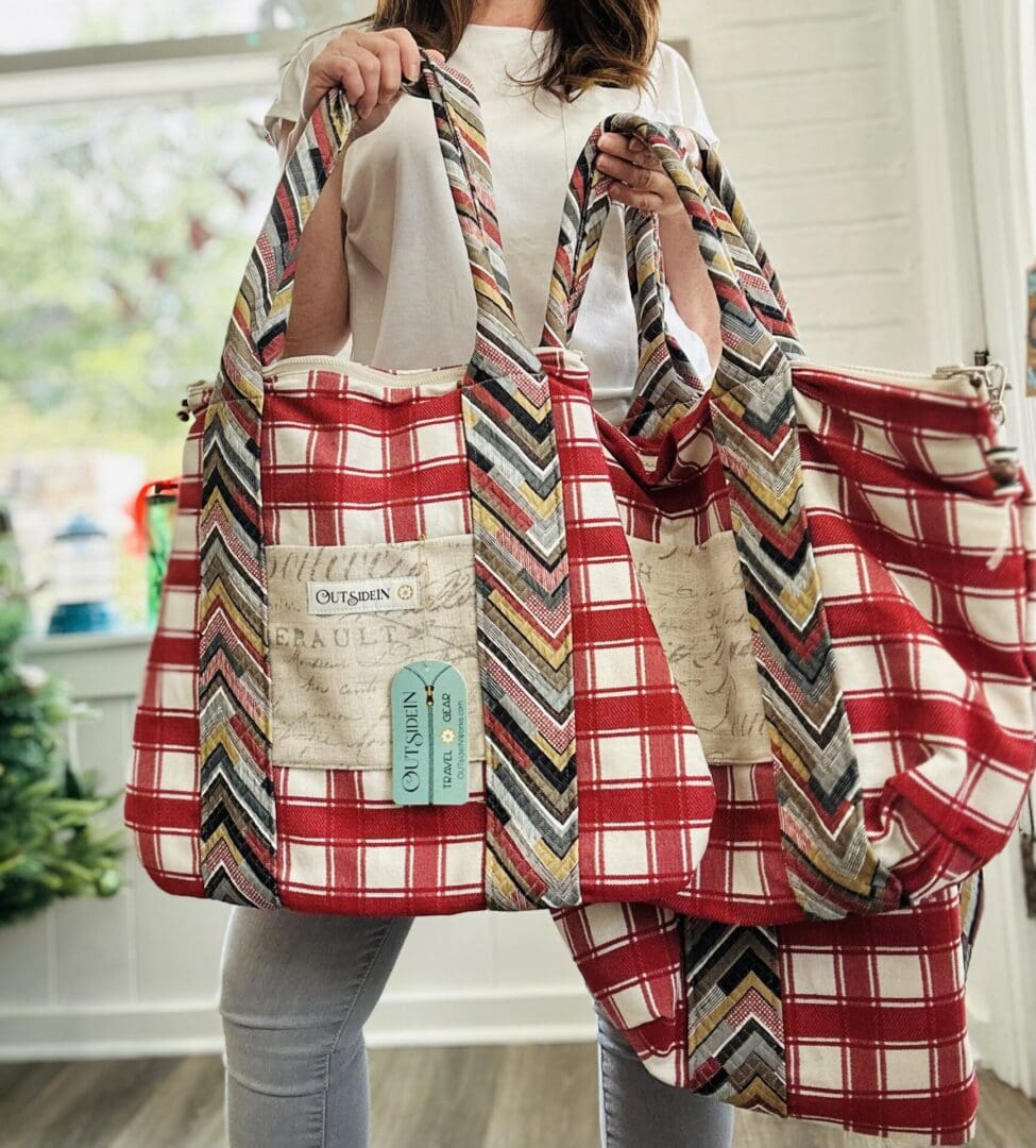 The Weekender Bag by OUTsideIN is simply a larger version of our very popular LoadUPs Tote Bag. It measures 30″ at the top and sits open easily on its 11″ base. The handles are 18″ and fit comfortably on your shoulder. The bag is 18″ tall with a 10″x8″ pocket on one side and two 5″x10″ pockets on the other side. It closes with a heavy duty #10 YKK zipper and is fully lined. The zipper pull has been decorated by hand with a small collection of buttons and beads when the bag is complete.